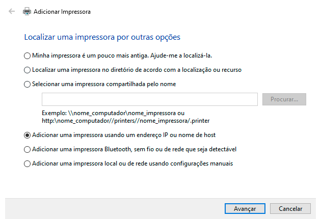 - Agora escolha a opção para adicionar a impressora através do IP.