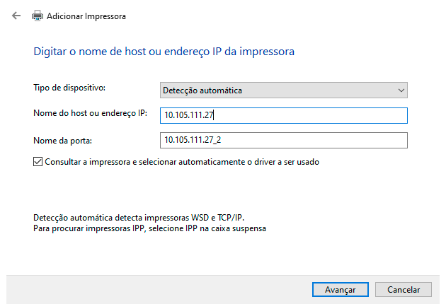 - Digite o IP da impressora – 10.105.111.27.