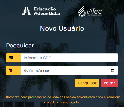 Acesse: https://sad-apac.educadventista.org/ e clique em Novo Usuário
