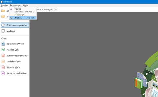 Abra o LibreOffice e na tela principal clique em Ferramentas e selecione Opções.